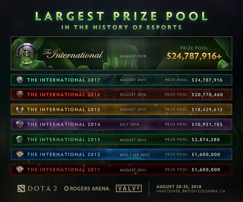 Sampai pagi tadi, angka total prize pool TI 8 sudah melebihi angka 24.787.916 Dolar Amerika total hadiah gelaran The International 2017. Ini berarti setiap tahun, total hadiah gelaran The International dari tahun ke tahun belum pernah turun.