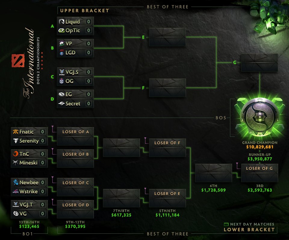 Seperti prediksi Kincir untuk fase grup, Team Liquid, EG, PSG.LGD, dan OG muncul sebagai 4 tim yang lolos ke Upper Bracket dari klasemen grup A, sedangkan di klasesmen grup B, VGJ.Storm, Virtus Pro, Team Secret, dan OpTic Gaming lolos sebagai 4 tim lain. Tadinya, Newbee berkesempatan untuk lolos ke Upper Bracket dari grup B, namun harus kalah saat melakukan tiebreakers melawan Secret dan OpTic.