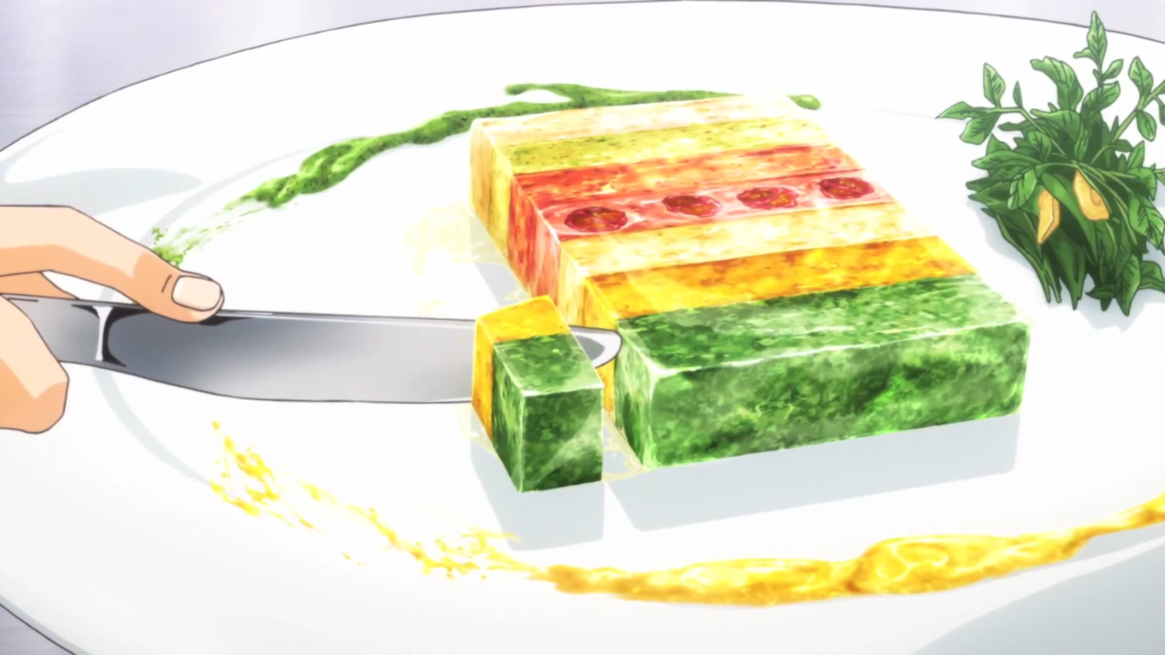 Masakan ini begitu unik karena terbuat dari tujuh sayuran berbeda sebagai bahan dasarnya sehingga menghasilkan permainan warna laksana pelangi yang memanjakan mata. Terrine bikinan Megumi juga dikombinasikan dengan saus manis dan saus herbal serta sejumput bumbu rahasia bernama all-spice. Meski kalah telak saat proses penjurian, Shinomiya mengakui bahwa Terrine buatan Megumi punya satu kelebihan yang enggak dimiliki Terrine buatannya, yakni sensasi kasih dan kehangatan masakan seorang ibu.