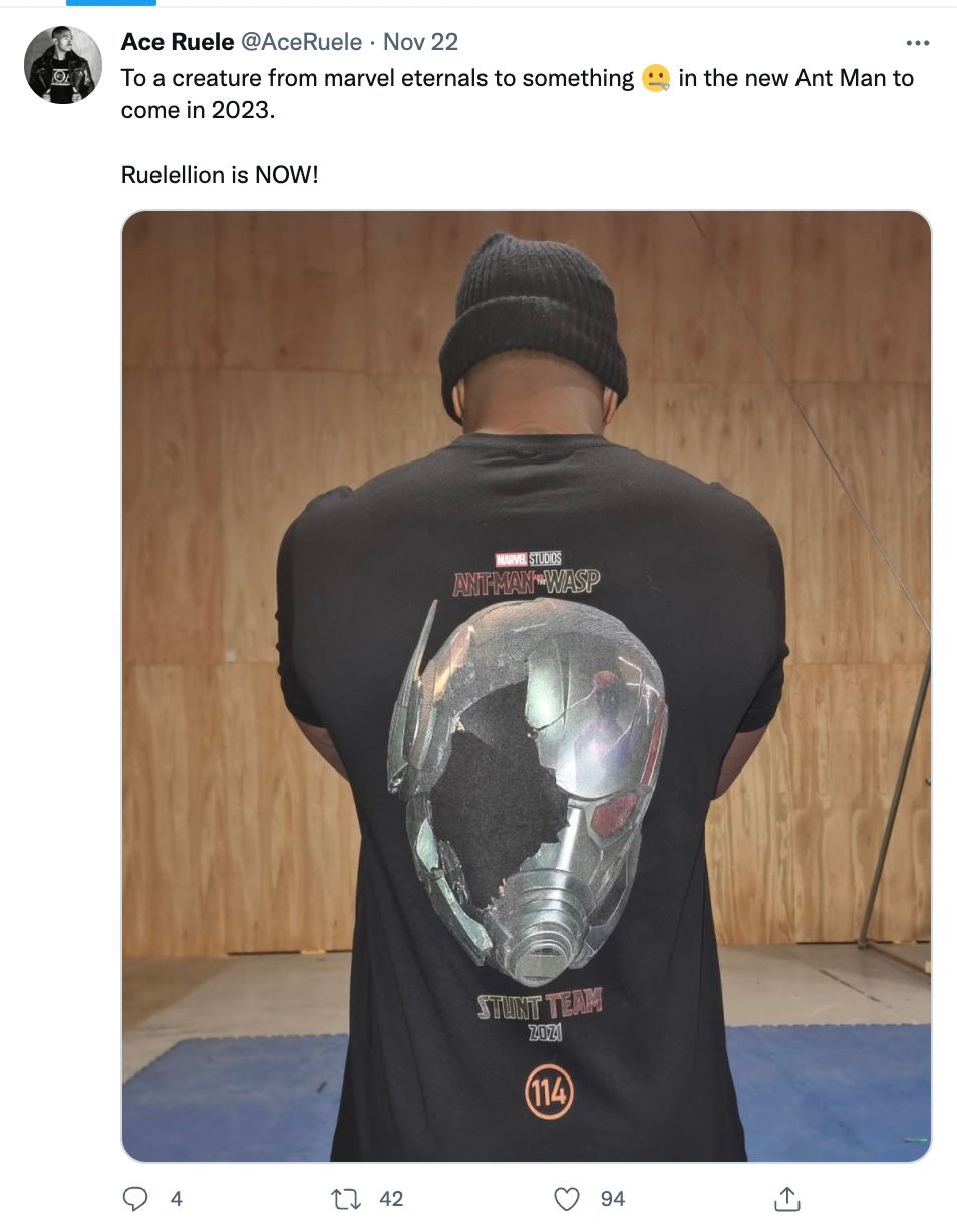 Jadi, salah satu kru Ant-Man and the Wasp: Quantumania bernama Ace Ruele membagikan foto di Twitter yang menampilkan dirinya sedang memakai baju merchandise yang dikhususkan untuk tim stuntman. Sayangnya, Ruele kini telah menghapus foto tersebut. Lantas, apa yang membuat Ruele sampai menghapus foto tersebut dari akun Twitter-nya.