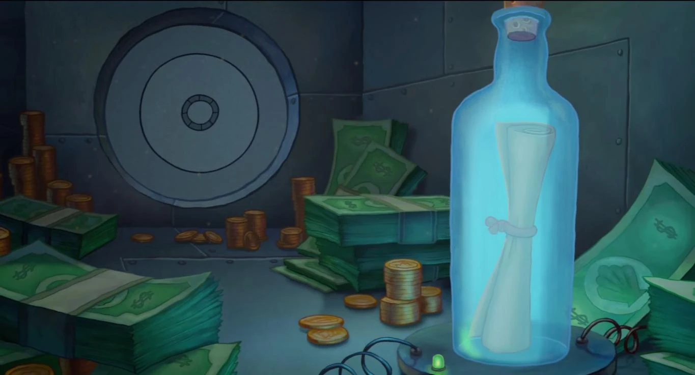 Tuan Krabs bilang resep rahasia sesungguhnya dia simpan dalam tempat yang paling aman sampai-sampai Plankton enggak bakal kepikiran. Namun, Squidward dengan mudah nebak ada di bawah kasurnya. Yah, Tuan Krabs sendiri, sih, kita lihat, tidurnya di ayunan terus, ya. Makanya, ada asumsi bahwa Tuan Krabs udah mindahin resep rahasia Krabby Patty. Apalagi, sepanjang waralaba ini disiarin, resep rahasia—berwujud lembaran kertas yang disimpan dalam botol—selalu disimpan dalam Krusty Krab.