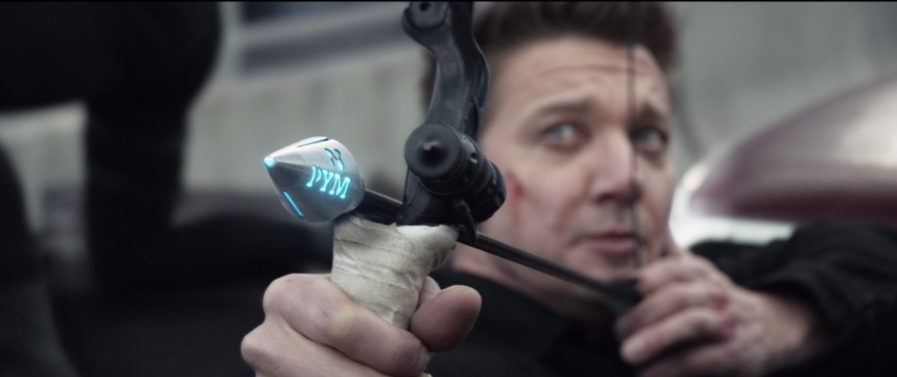 Beberapa trik dari panah tersebut pun antara lain adalah panah dengan gel panah yang mengeluarkan tali, panah dengan bahan peledak, hingga panah dengan flashdisk sekalipun. Namun, trik panah yang paling menarik adalah panah berisi Pym Particle yang bisa membuat objek lain berubah ukuran menjadi raksasa. Adegan ini pun benar-benar menyorot alat yang Clint gunakan ketika bertarung melawan musuhnya.