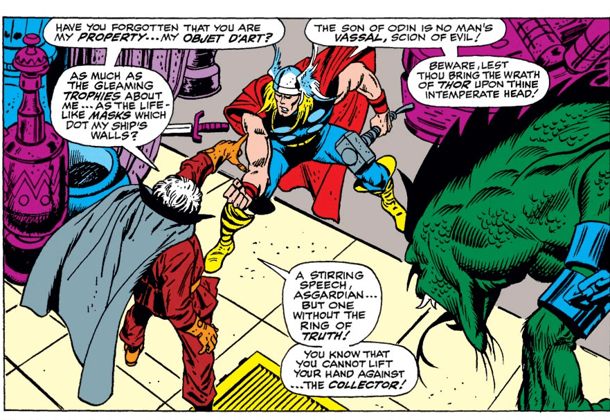 Hal ini pun terjadi ketika debut di komik The Avengers #28 yang rilis pada 1966. Dalam komik itu, The Collector dikisahkan memiliki satu tujuan, yaitu mengoleksi anggota Avengers karena menurutnya adalah individu berkekuatan super yang patut jadi koleksinya. Anggota Avengers pertama yang berhasil menjadi koleksi The Collector adalah Wasp yang sukses ditangkapnya dengan bantuan dari Beetle.