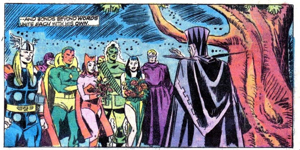 Setelah lamarannya diterima, Wanda dan Vision pun menikah dan dihadiri oleh sejumlah anggota Avengers lainnya. Menariknya, Wanda dan Vision bukan satu-satunya pasangan yang menikah di saat itu. Soalnya, upacara pernikahan mereka berdua juga dilaksanakan untuk merayakan perkawinan dari dua anggota Avengers lainnya, yaitu Mantis dan Cotati yang telah mengambil alih tubuh Swordsman.